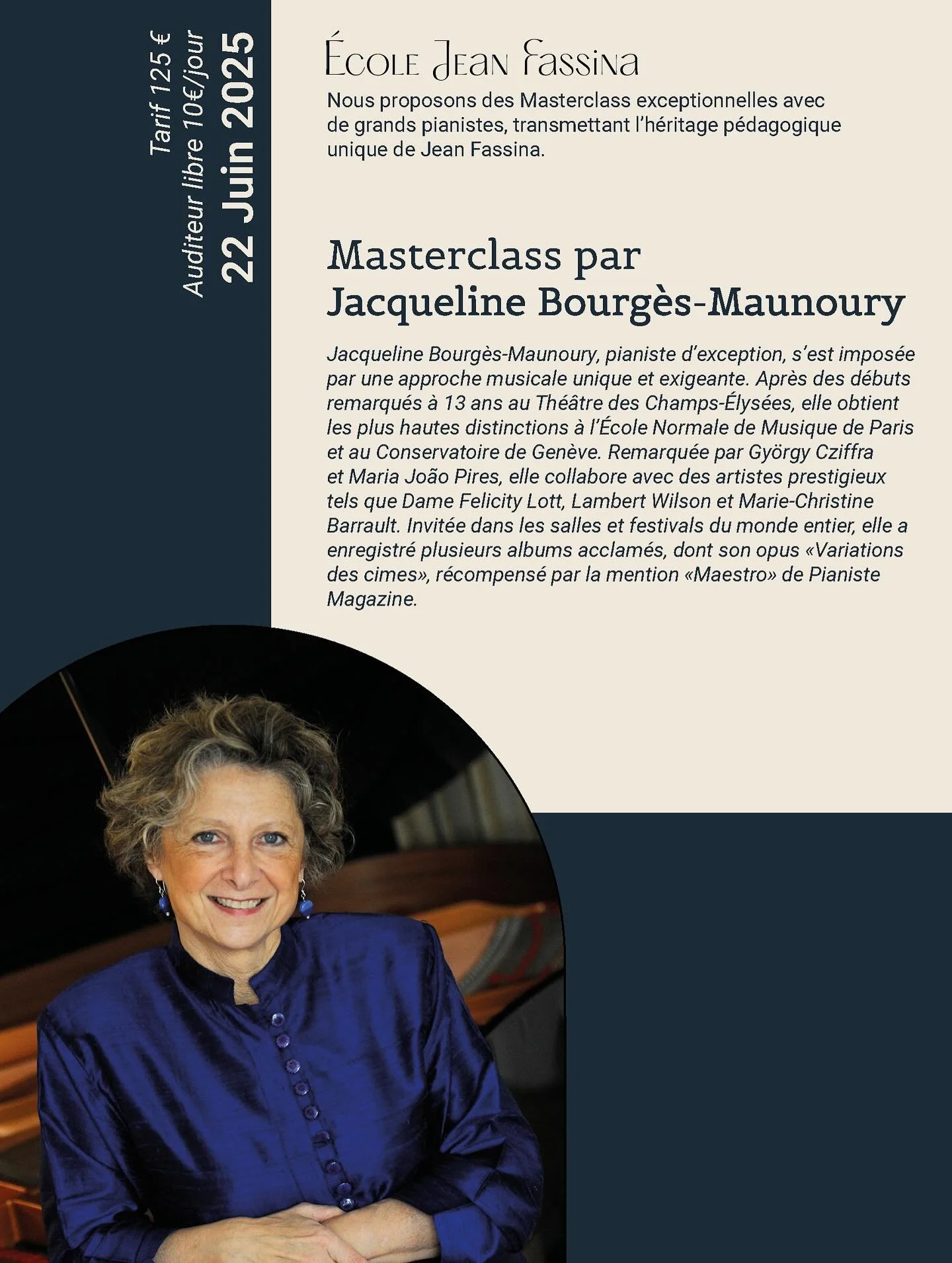 Riche de son travail auprès de Jean Fassina, pédagogue issu de la grande tradition polonaise depuis Paderewski, Jacqueline Bourgès-Maunoury aime transmettre ce savoir aux jeunes pianistes.